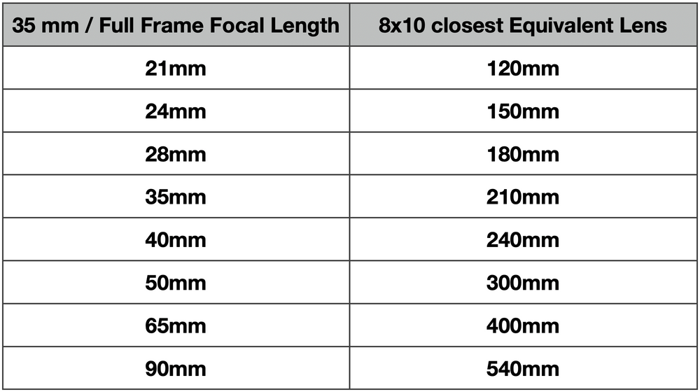 - Normal (240mm - 360mm): Offering a field of view similar to the human eye, these lenses are versatile for various subjects, from portraits to still life. If you are used to lenses on 35mm cameras or full frame DSLRs a good trick is to multiply the focal length by 6. for example a 50mm lens on a 35mm camera is the equivalent to a 300mm lens on 8x10