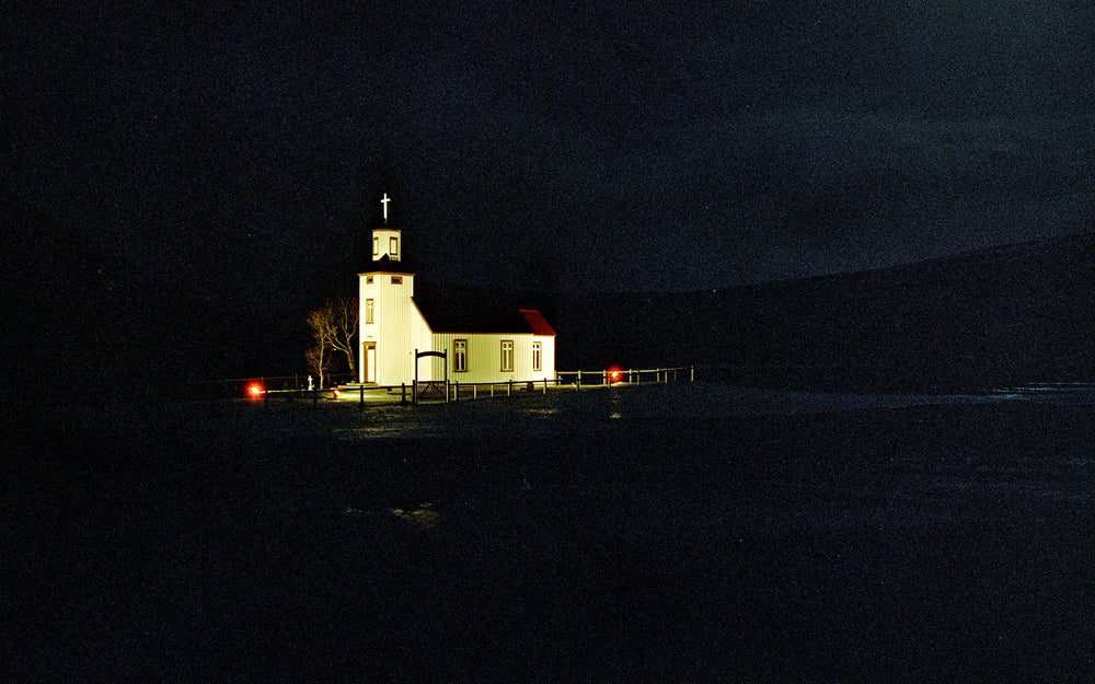 After a day of driving the Western loop, we headed on an altruistic journey into the ever-colder Northern region of Iceland. When we had plotted our trip, we knew that we needed to get away from the cities to have a chance at the Northern Lights. We valiantly drove 4 hours north to no avail but stayed at the most beautifully secluded guest house by a neon-lit church that wouldn’t be amiss in a music video by The Weeknd. I did my first ever LF night exposures fearing the reciprocity of failures ahead that I hadn’t accounted for. I managed to get an image from my 10-second F/22 exposure that I liked and matched it the following morning from the marker point I’d left. A little bit deflated by our far-flung failed gamble to see ‘the lights’, we journeyed back to the Keflavík Airport on a 4-hour drive to drop off our car and for our final night in Iceland before an early departure the next day.