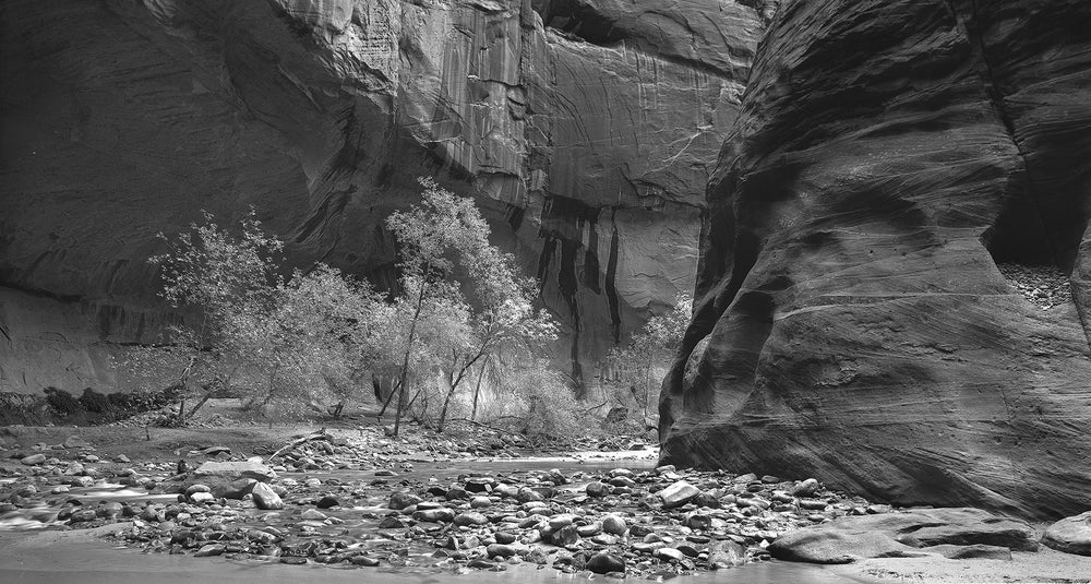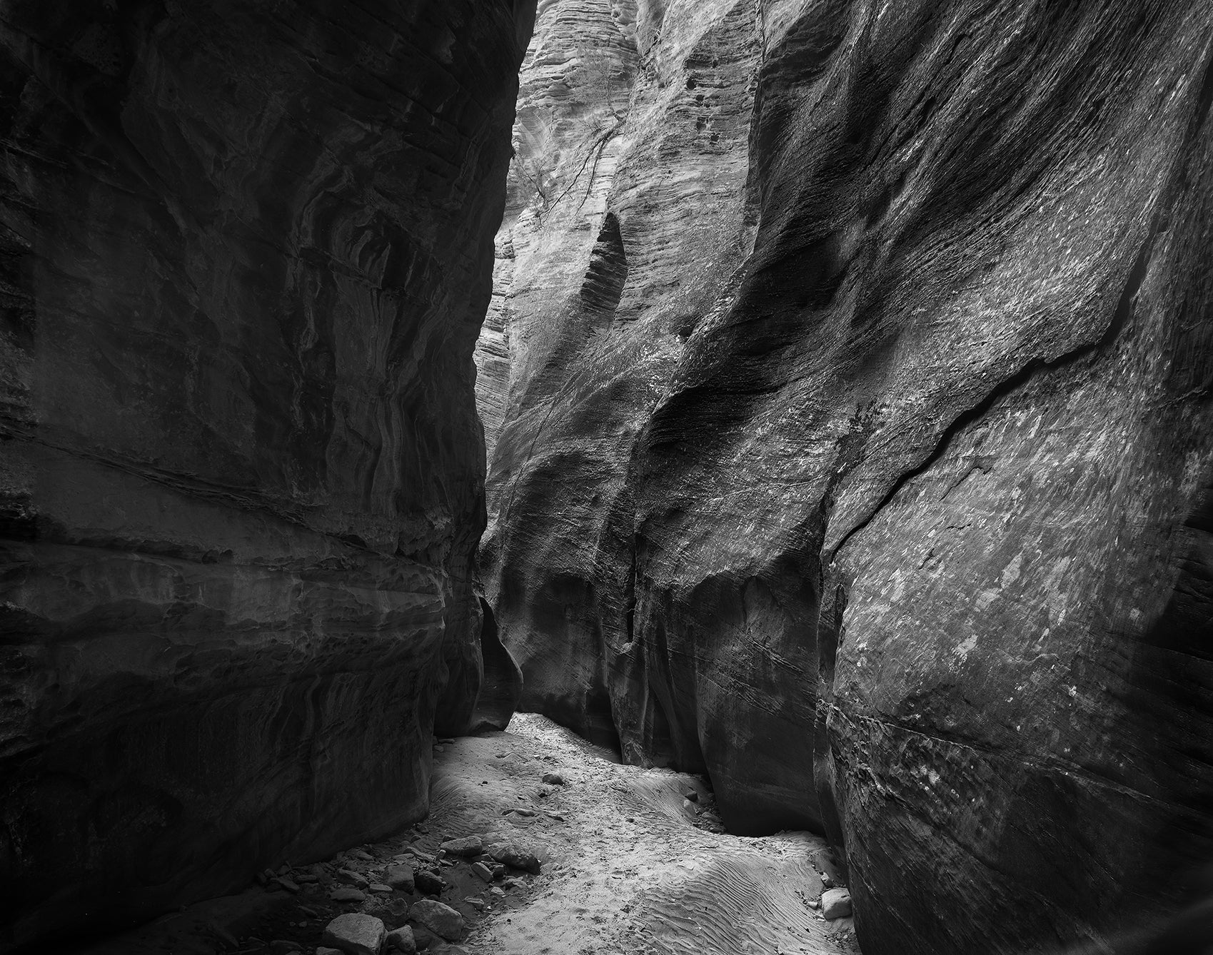 As the light began to fade, I made my way out of the Narrows for the day. As I passed through the “Paradise Cove” section of the Narrows, I noticed the reflected light was at its peak in this section of the canyon. This scene would have been perfect to capture on Fuji Velvia film, but unfortunately I was fresh out of not only the day’s packed supply of Velvia but also all of the Ektar, leaving me with only Fuji Neopan Acros black and white negative film. I decided to make one exposure on the black and white film because the scene was truly magnificent, and I figured it would be better to have it on black and white than not at all! Besides, there are numerous images of this scene in color all over the internet, but very few in black and white and even fewer on large format film.