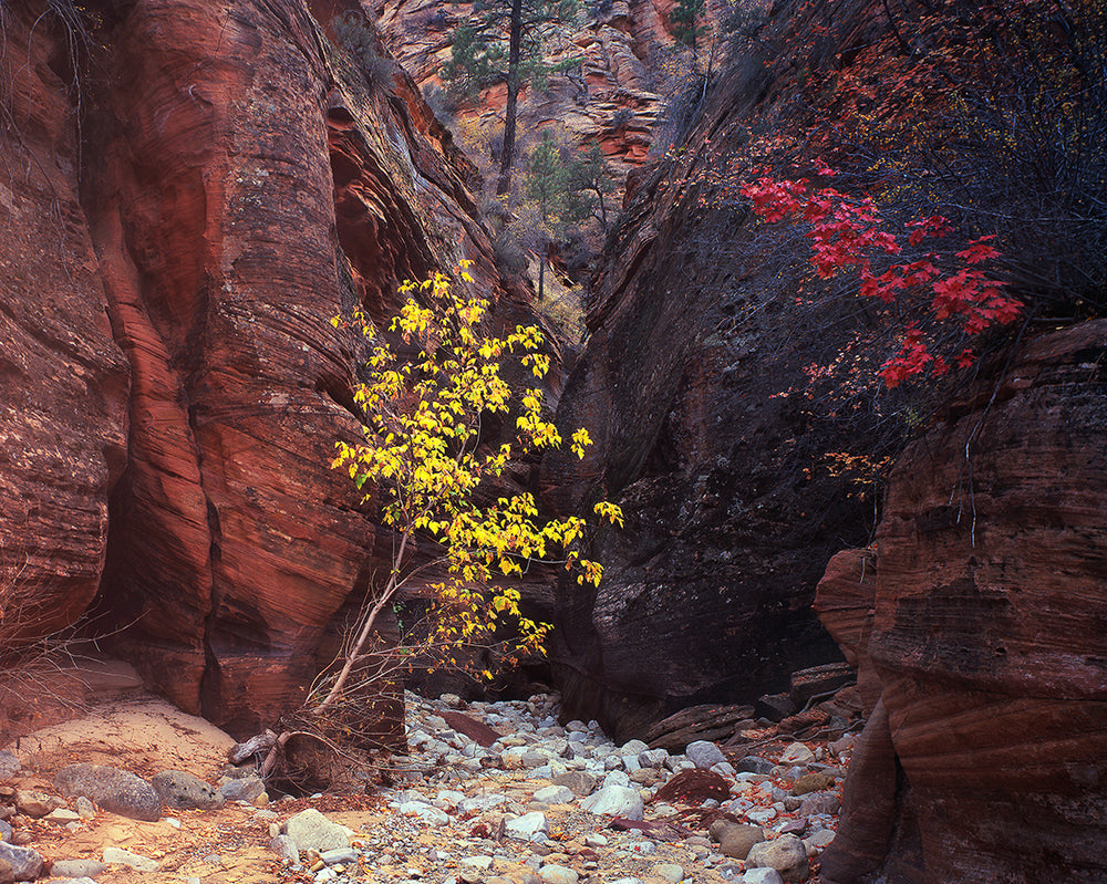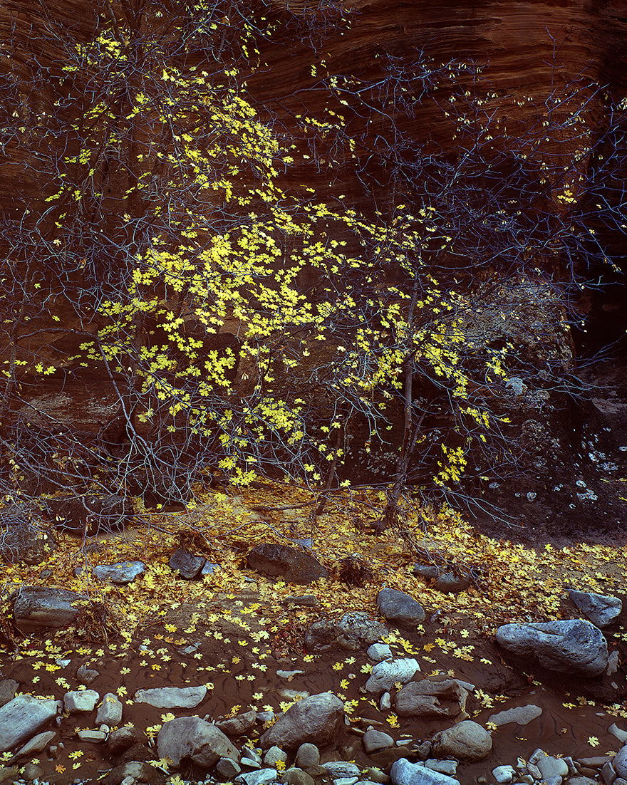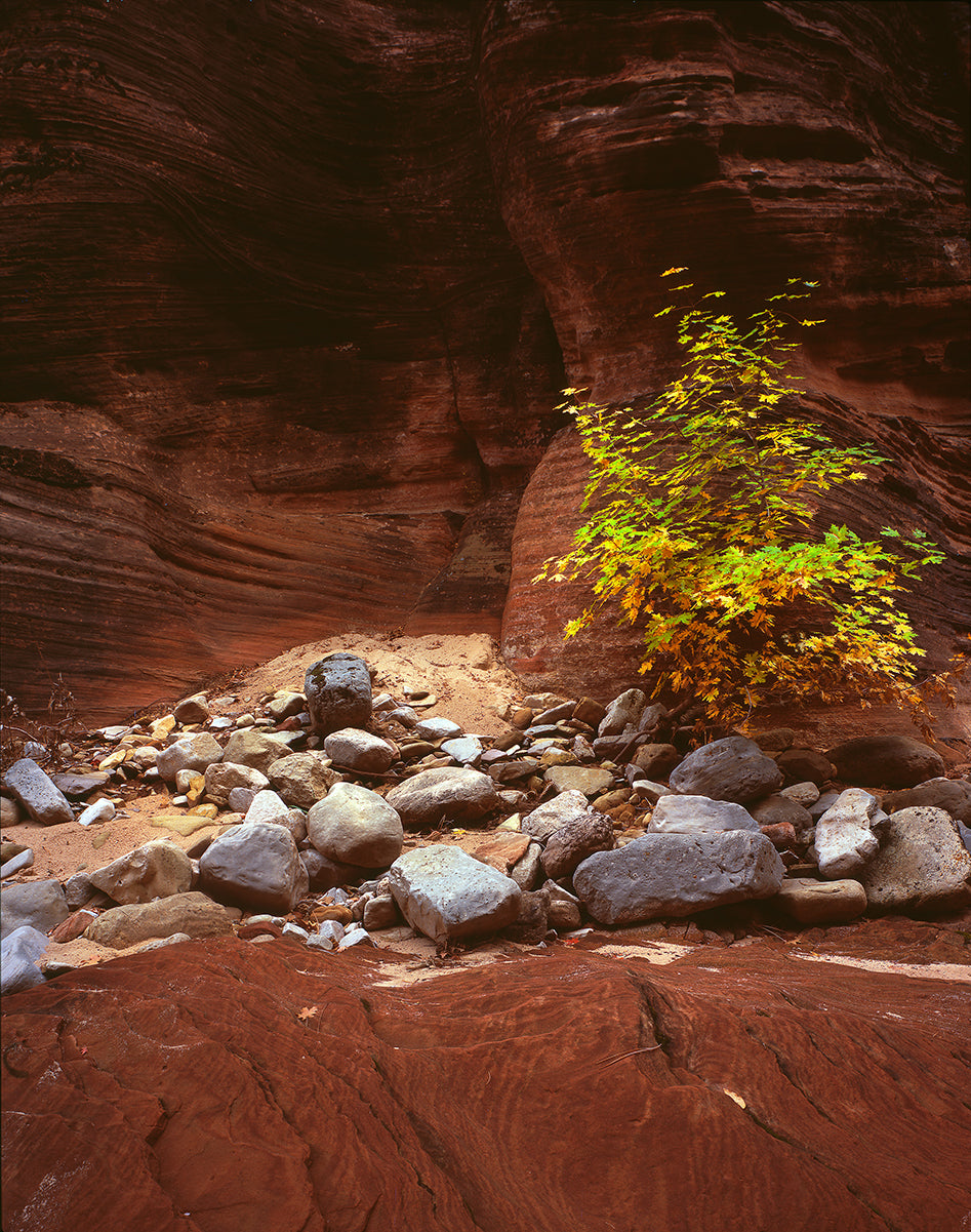 While I was in this section of canyon, I also made another exposure featuring a small maple sapling which had taken root inside of a rocky section of the slot canyon. It was amazing to me that such a small and delicate tree could survive in such a harsh environment, but there it was, adorned in the brilliant yellow coat of autumn color. I made one exposure with my Intrepid camera backed up against the opposite wall of the slot canyon on Fuji Velvia which captured the soft tones and filtered light of this scene beautifully.
