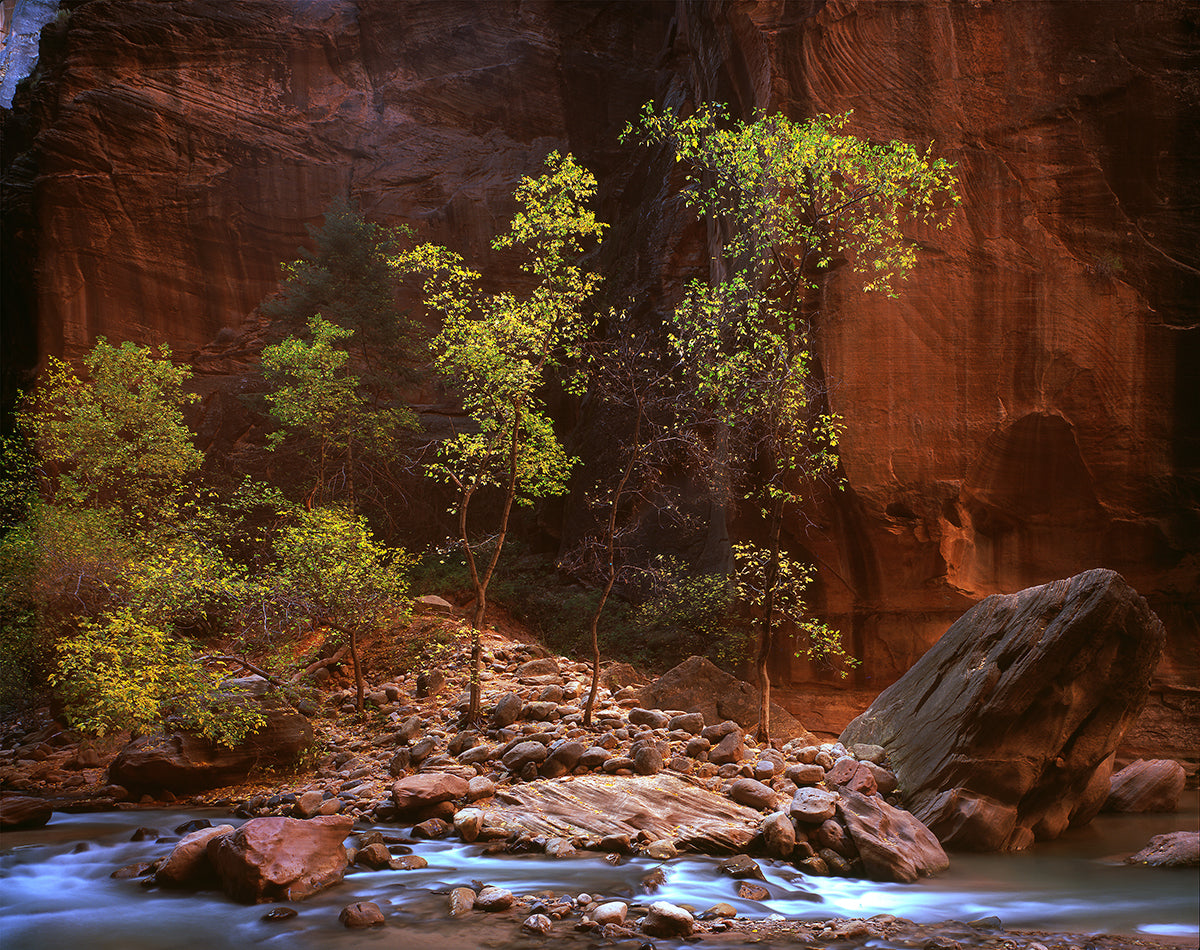 About halfway into my hike in the late morning, I found a spot in the river which was filled with gorgeous reflected light illuminating a towering red sandstone wall. A stand of Cottonwood trees adorned in the brilliant yellow of autumn color grew in an alcove there, sandwiched between the flowing blue and white tones of the Virgin river and the vivid reds of the wall behind them. I set up my Intrepid camera on the bank opposite the trees and made an exposure on Fuji Velvia 100 color transparency film. The leaves to me resemble a magical cloud of glowing fairies resting in the trees, so I titled the image, “Fairy Alcove.”