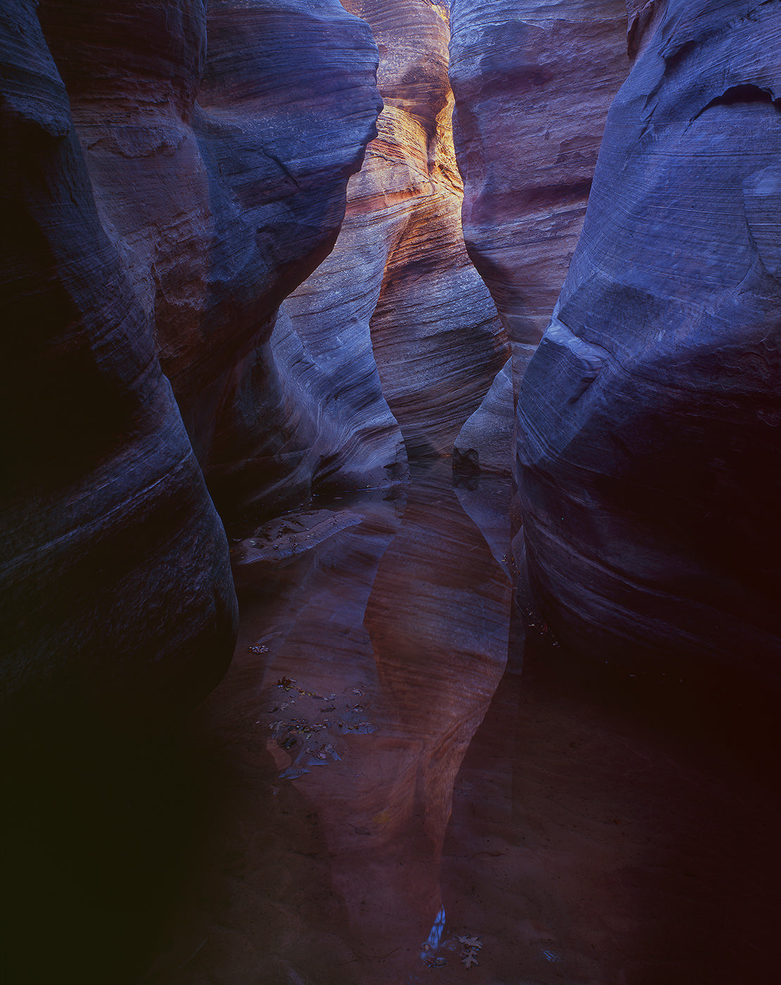 Late in the afternoon, I came across another flooded section of slot canyon that had not been touched by man since the flood had occurred, leaving it similarly pristine. In this canyon, the water formed a perfectly still sheet of glass which reflected the canyon walls above perfectly. The sun was shining at this point, and it formed beautiful reflected light as the sun illuminated the highest areas of the canyon walls and the light ricocheted back and forth down into the depths of the canyon. By the time the light reached the bottom, the colors had shifted to deep purplish blue tones, contrasting with the warmer orange tones higher up and forming a beautiful contrast. I photographed this scene with my Intrepid camera on Fujifilm Velvia 100 color transparency film using my Schneider-Kreuznach 90mm ƒ/8 lens.