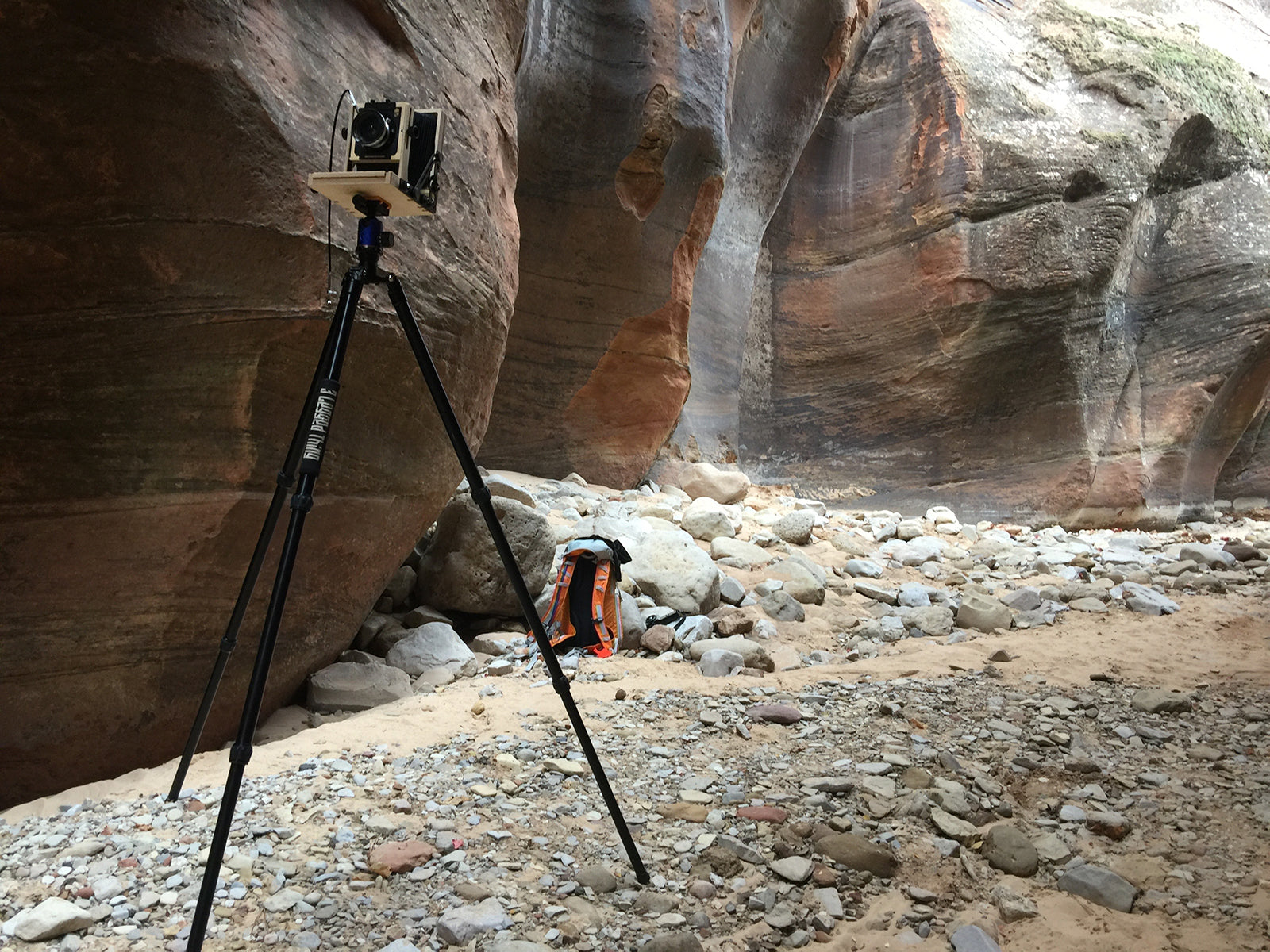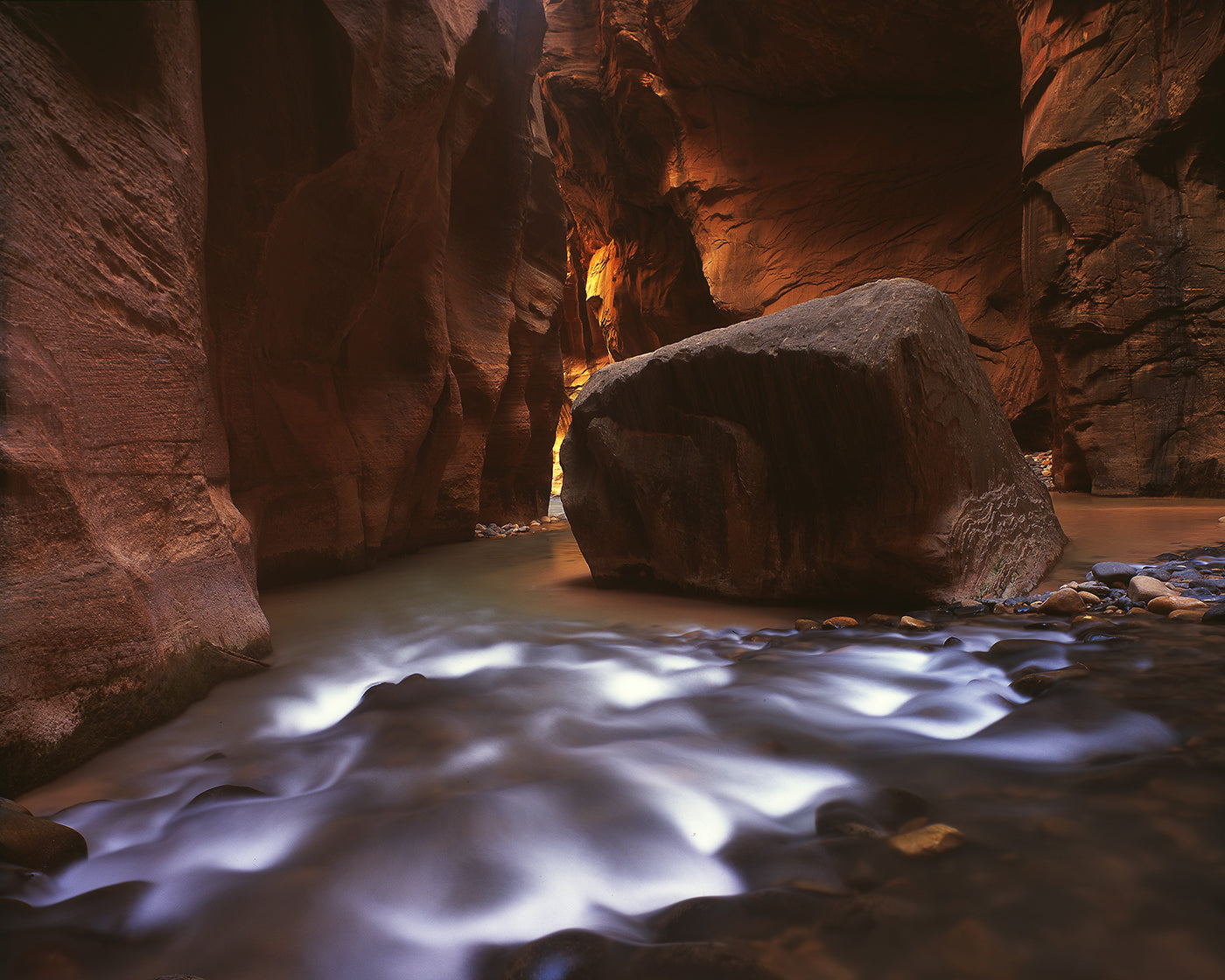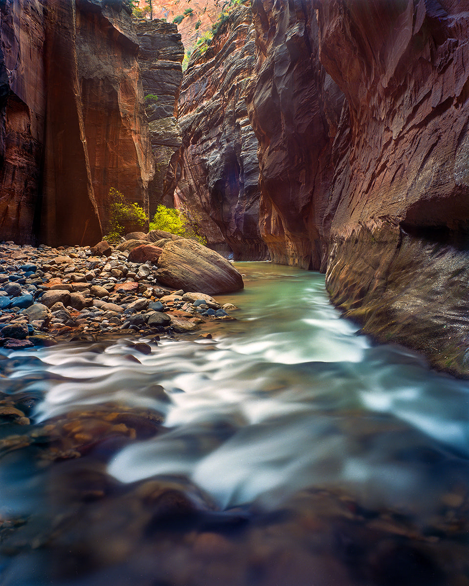 Later in the afternoon, when reflected light was at its peak for the day, I stopped for about an hour to photograph two famous scenes in the Wall Street section of the Narrows. The first scene was a composition I’d photographed back in 2013 with my DSLR, and I wanted to return to create a new version of the image on large format film. After waiting for the clouds to blow away and the sun to create the beautiful reflected light I was looking for, I finally exposed the frame of Fuji Velvia 100 color transparency film you see here. This boulder is known as the “Imlay Boulder,” and is one of the most photographed things in Zion National Park. I don’t claim this to be an original composition, though ironically the first time I photographed it I’d never seen any other image of the boulder before! I suppose this composition is a rather obvious one, but it is strikingly beautiful nonetheless, and I was happy to be able to replace my earlier digital image with one displaying the strong aesthetic character and supreme image quality that we love so much about large format Fuji Velvia film. I also captured this scene on Kodak Ektar color negative film, but I liked the compressed dynamic range and more vivid colors of the Velvia better when I got both film sheets back from the lab, so I chose to use the Velvia version.