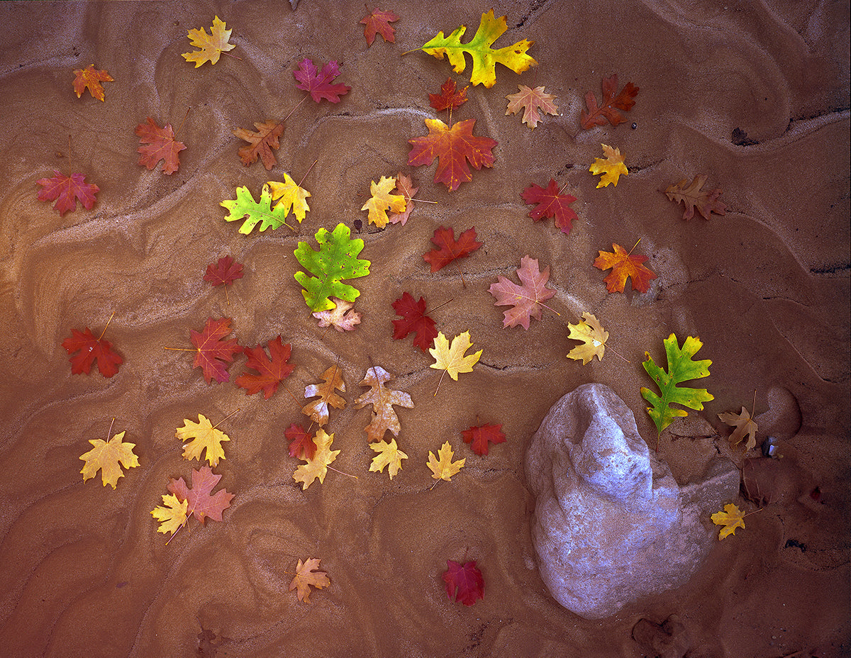 A few days later, I stumbled across another scene of fallen leaves on wet mud ripples, this one exclusively covered in maples on a darker mud, covering a larger area. I set up the tripod leaning against a large boulder behind me and again carefully focused the ground glass from above, capturing this exposure.