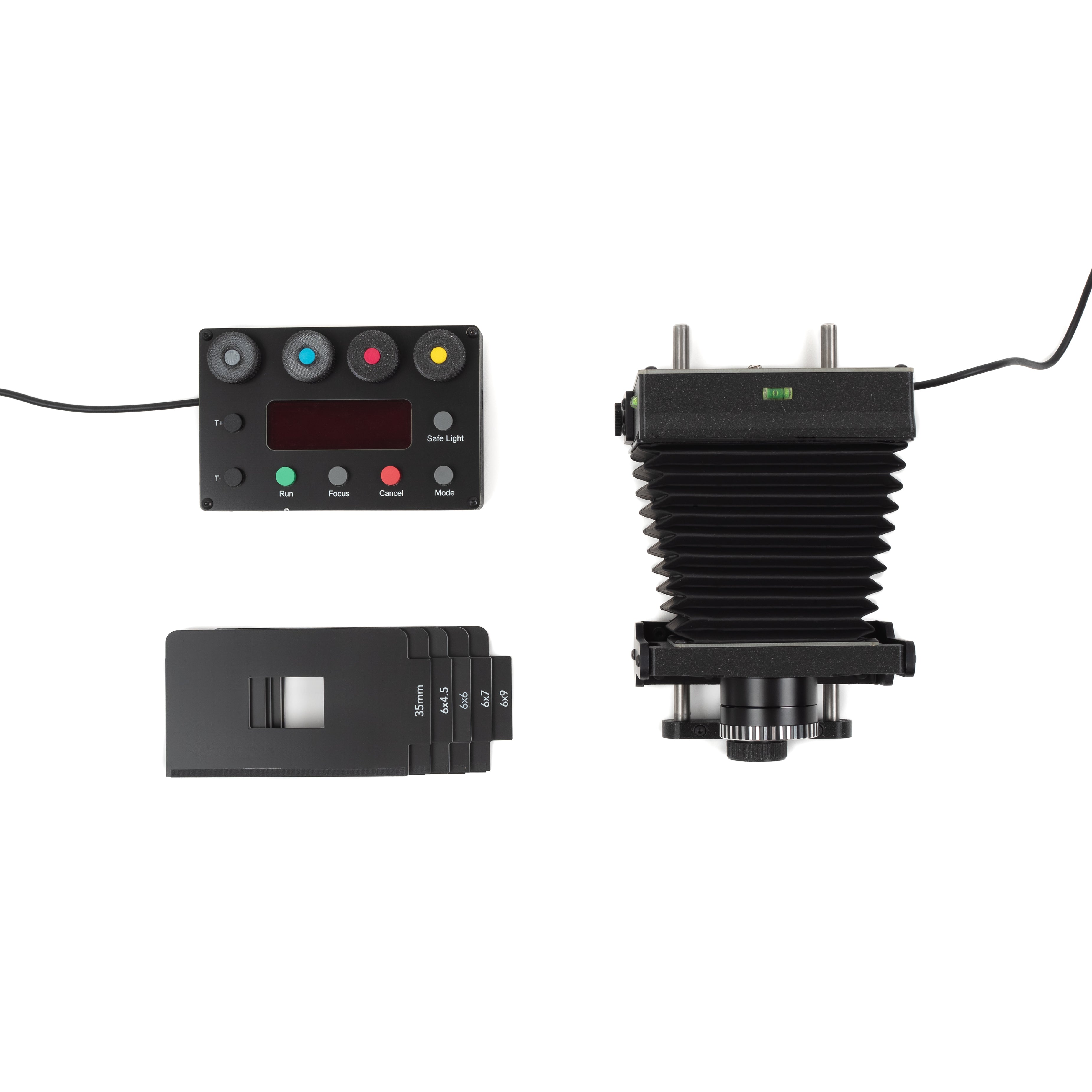 Screw in your Enlarger lens (M39 mount). Many excellent quality enlarger lenses are available second hand. for 35mm we recommend a 50mm lens, for 6x4.5 to 6x7 a 80mm lens and a 105mm lens for the 6x9 size carrier.