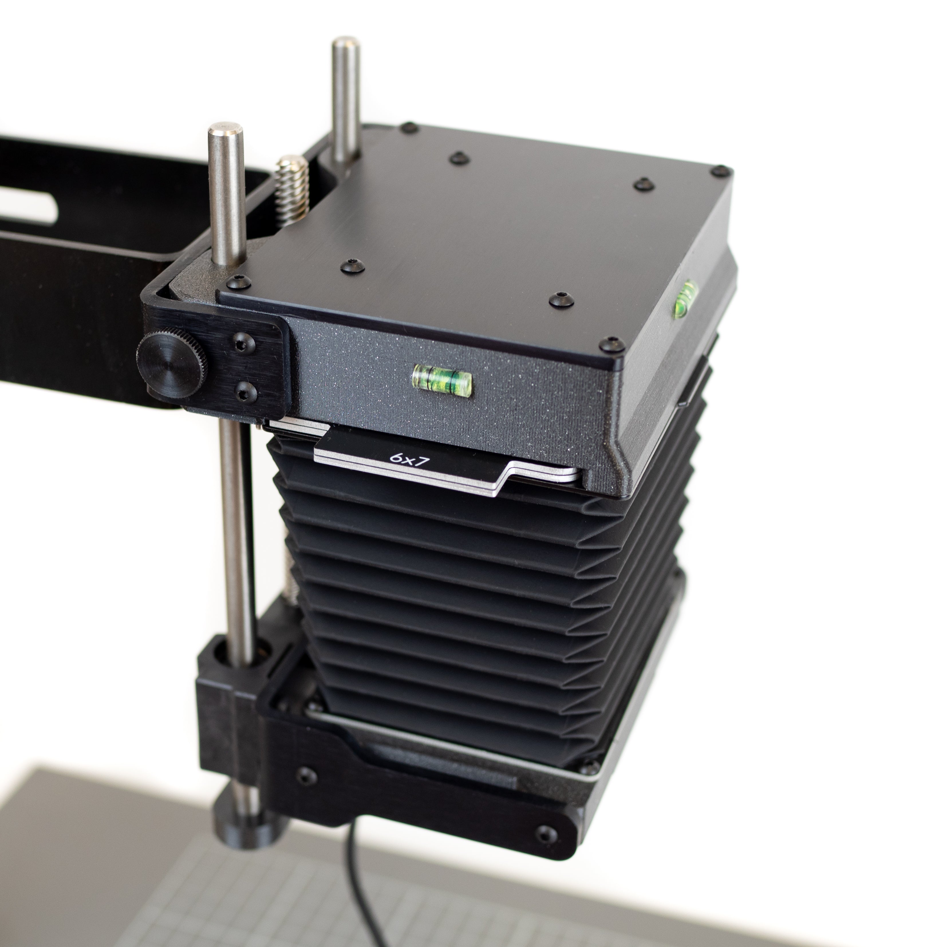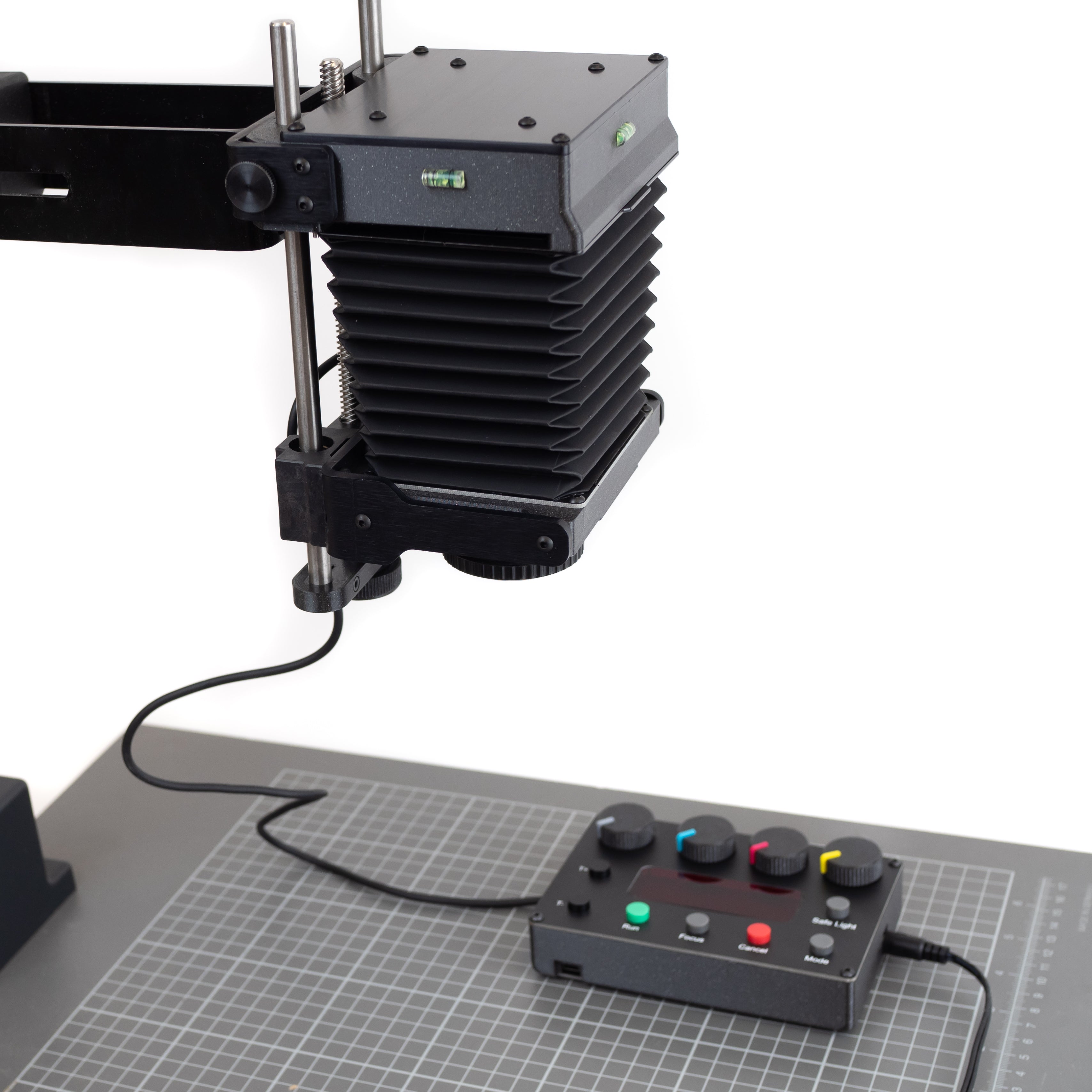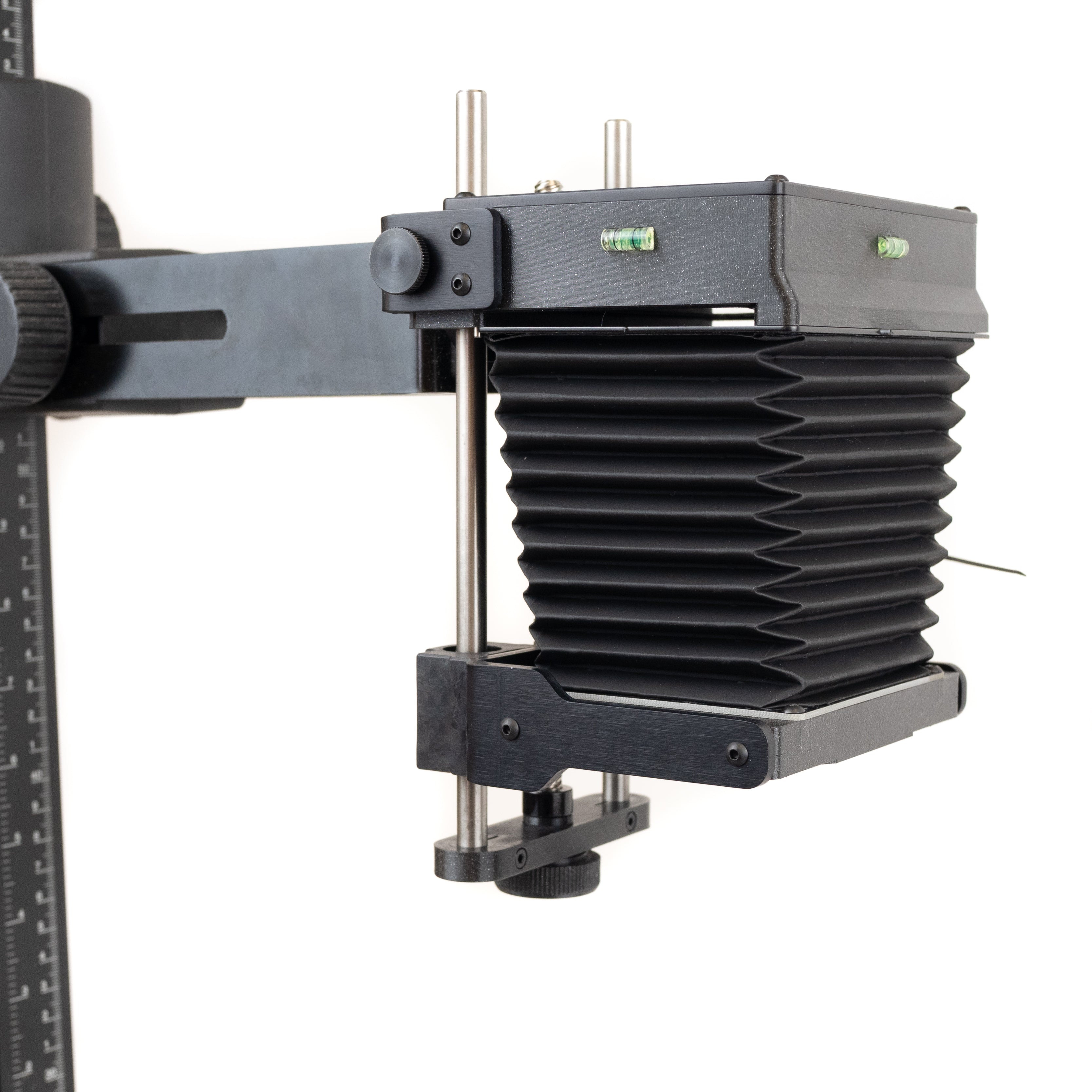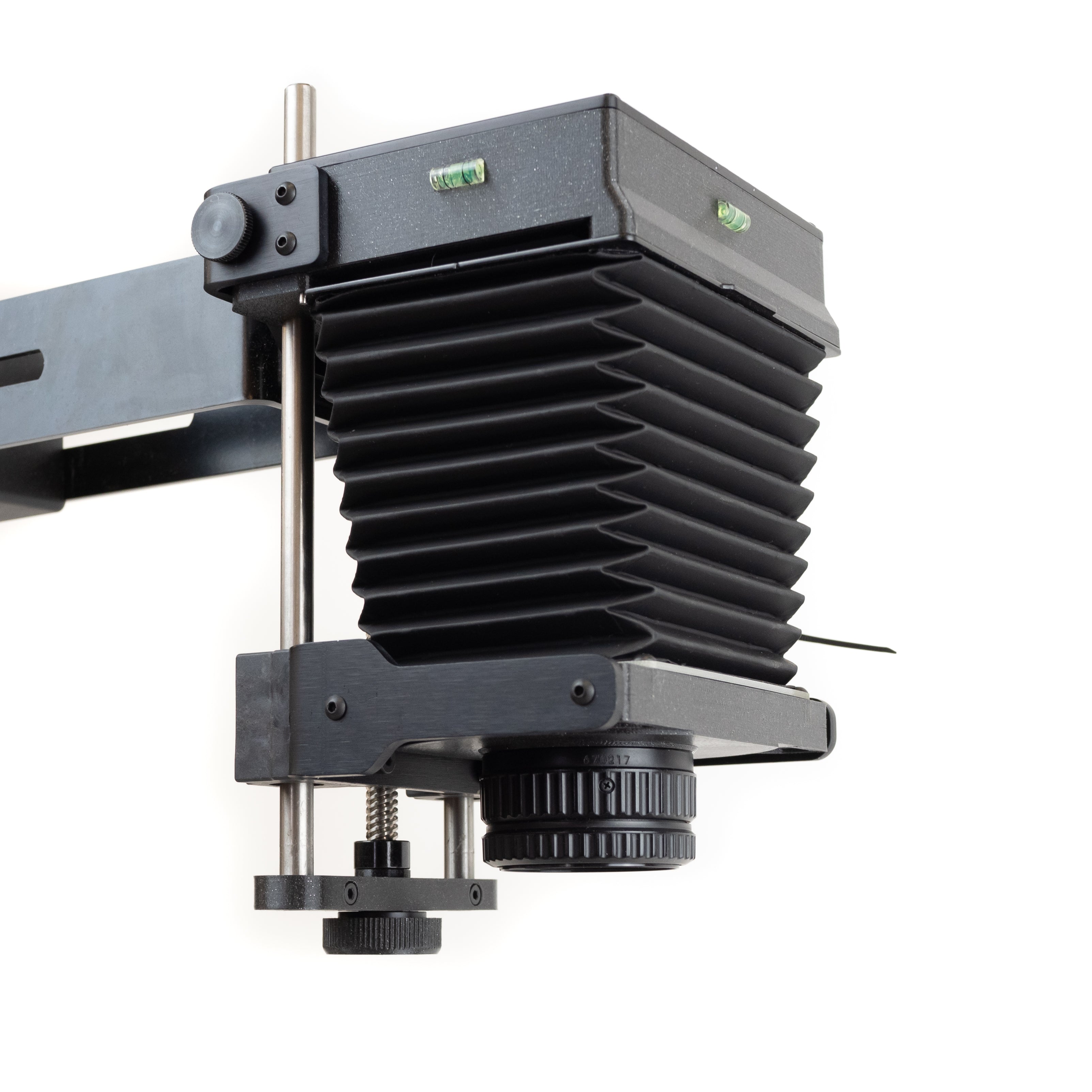 Mount your Enlarger unit to a tripod or copy stand. A copy stand is easier to use but if you are on budget a well set up tripod can still produce impressive results. The Compact Enlarger has a standard 1/4 20tpi thread.