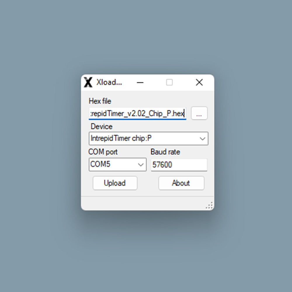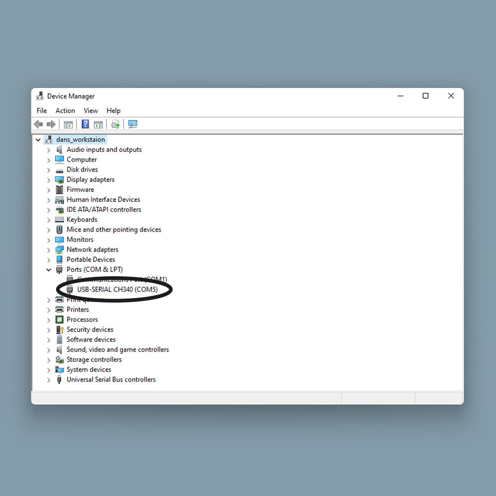 Make sure the timer is disconnected from power then connect the timer to your computer with a USB mini cable (the text on the screen may be faint or not visible), check the device manager to see that it has been recognised, it should show up as “USB Serial Port (COMxx)” or “USB-SERIAL CH340 (COMxx)” under the “Ports (COM & LPT)” section.