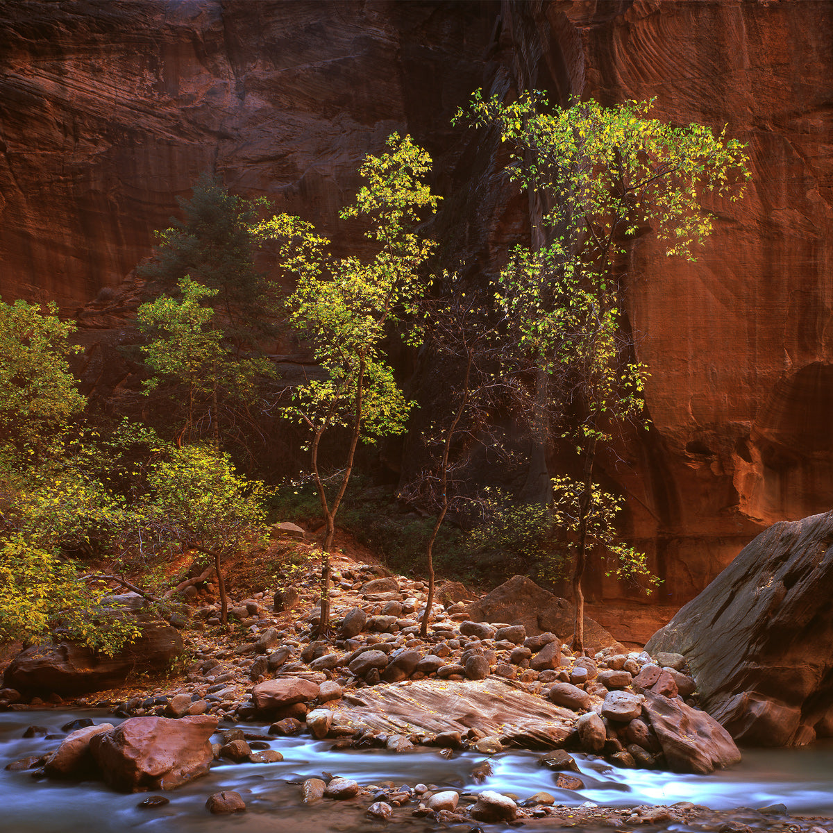 About halfway into my hike in the late morning, I found a spot in the river which was filled with gorgeous reflected light illuminating a towering red sandstone wall. A stand of Cottonwood trees adorned in the brilliant yellow of autumn color grew in an alcove there, sandwiched between the flowing blue and white tones of the Virgin river and the vivid reds of the wall behind them. I set up my Intrepid camera on the bank opposite the trees and made an exposure on Fuji Velvia 100 color transparency film. The leaves to me resemble a magical cloud of glowing fairies resting in the trees, so I titled the image, “Fairy Alcove.”