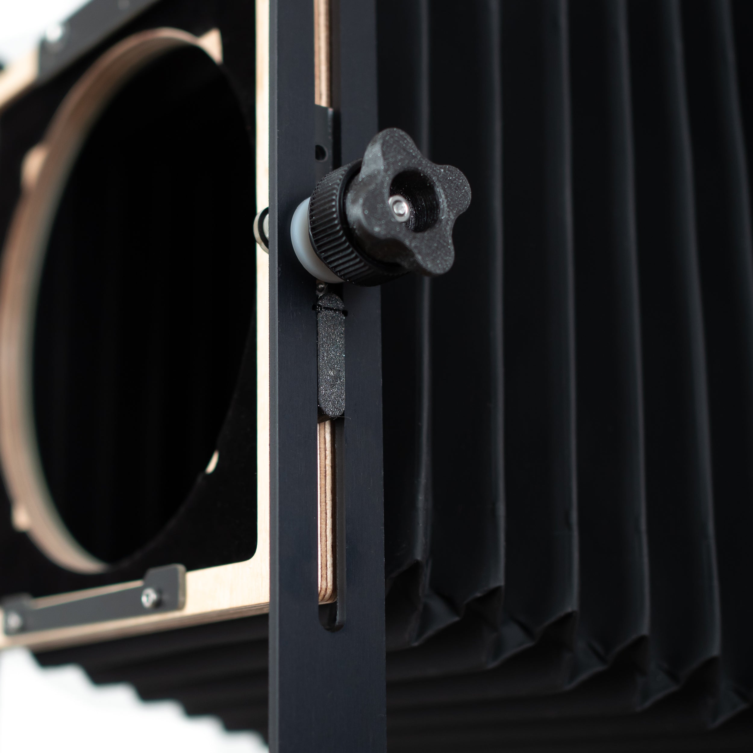 The front standard is where the lens/lens board is mounted. It can also be moved independently to utilise the front standard movements (rise/fall and tilt/swing.)